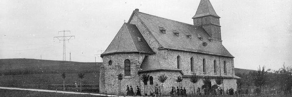 „Die katholische Pfarrkirche „Mariä Himmelfahrt in Eitelborn wurde in den Jahren 1923 bis 1925 errichtet. Diese Jahreszahlen finden sich auch auf einer Inschrift am Chorbogen. Bei dem, aus unverputztem Bruchsteinmauerwerk hergestellten Gebäude handelt es sich um einen Saalbau mit eingezogenem, polygonalen Chor und südlichem Frontturm.
