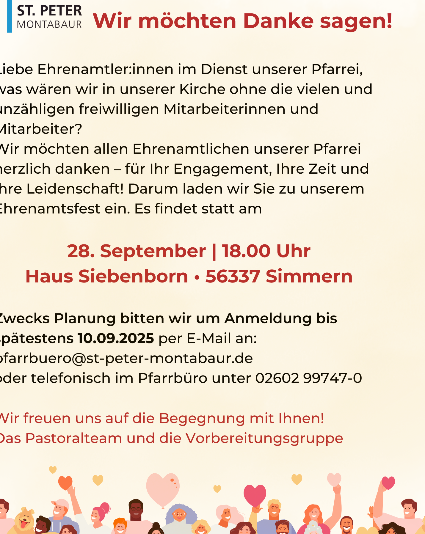 Zwecks Planung bitten wir um Anmeldung bis spätestens 10.09.2025 per E-Mail an: pfarrbuero@st-peter-montabaur.de oder telefonisch im Pfarrbüro unter 02602 99747-0.
