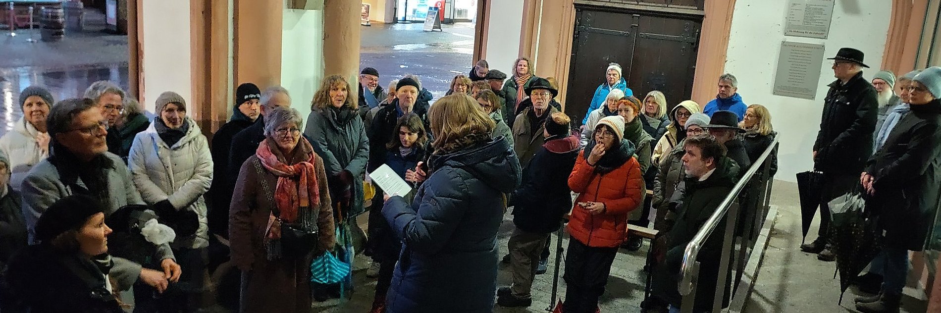 „Hier aus ihrem Haus wurden die Bewohnerinnen und Bewohner, oftmals alt und krank, an den Haaren zum Rathaus geschleppt um dann deportiert zu werden!“ So oder so ähnlich erzählte Beatrix Künzer an mehreren Stationen des Gangs zu Stolpersteinen.