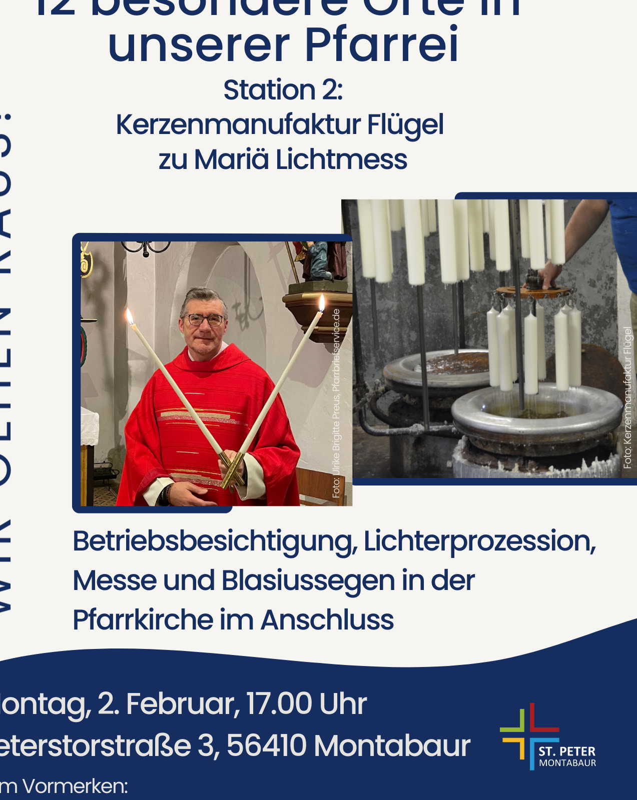 - Station 2: Montag, 2. Februar, 17.00 Uhr (Mariä Lichtmess) – Kerzenmanufaktur Flügel, Peterstorstraße 3, 56410 Montabaur